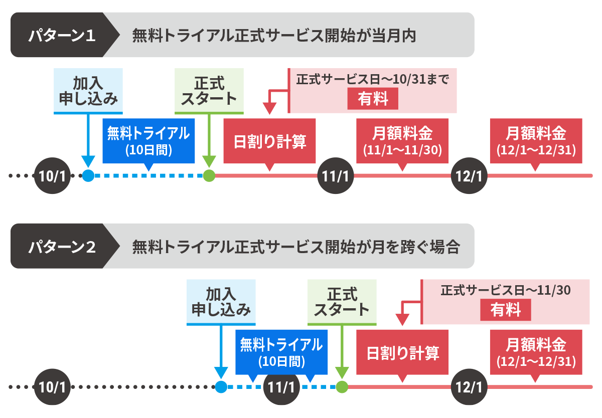 暦月で1日から末日までの1か月単位でのご利用となり、毎月自動で月額料金での契約更新となります。個人向け契約(有料プラン)開始月は日割り計算でのご契約となり、翌月1日から月額料金での自動契約更新となります(下図参照)。